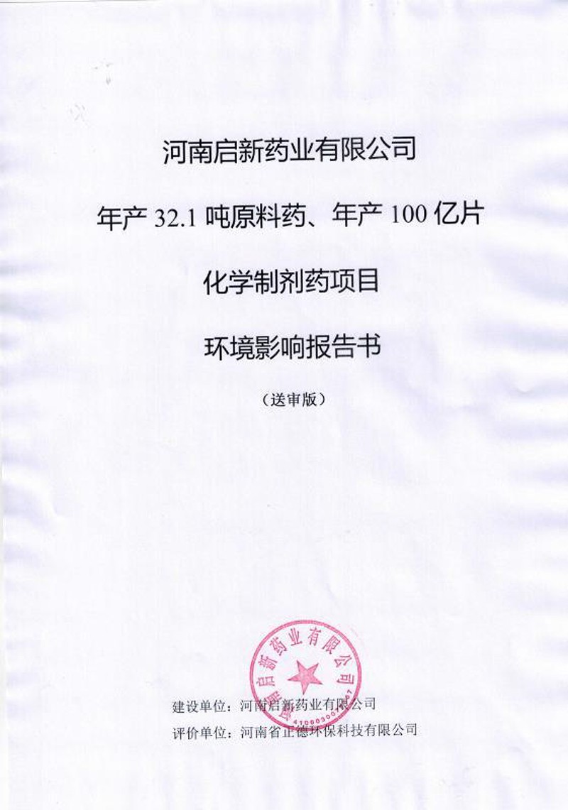 河南啟新藥業有限公司年產32.1噸原料藥、年產100億片化學制劑藥項目環境影響報告書