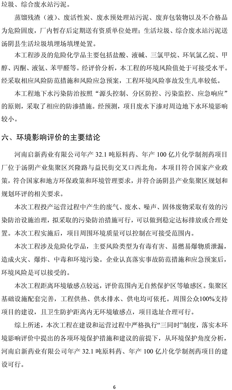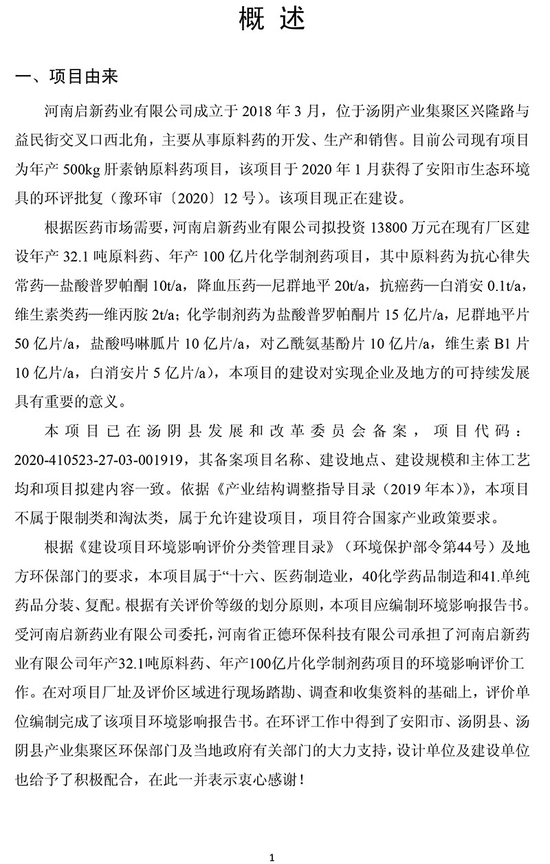 河南啟新藥業有限公司年產32.1噸原料藥、年產100億片 化學制劑藥項目 環境影響報告書